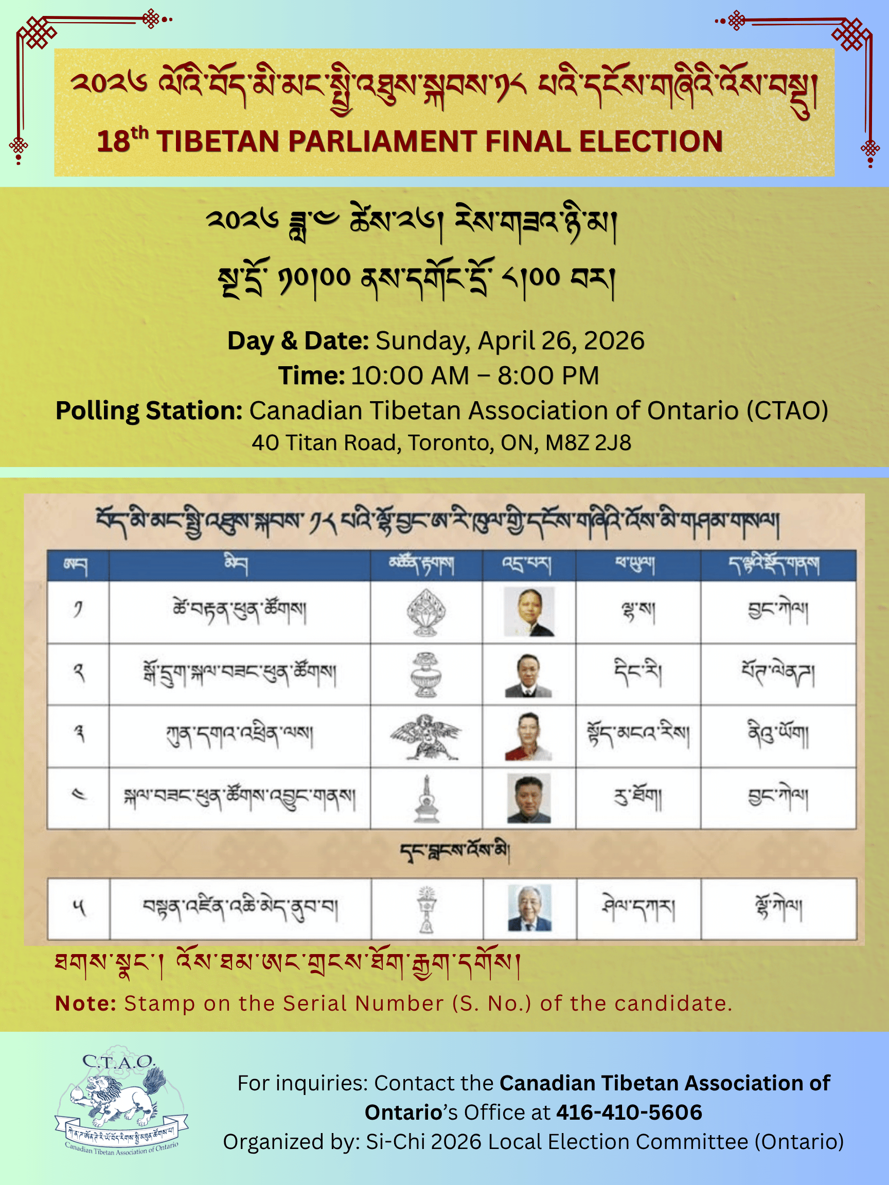 བུས་བོད་མི་སྒྲིག་འཛུགས་ཀྱི་སྲིད་སྐྱོང་དང་། བོད་མི་མང་སྤྱི་འཐུས་སྐབས་ ༡༨ སྔོན་འགྲོའི་འོས་བསྡུའི་གནས་དོན་ཁག🗓 ༢༠༢༦ ཟླ་༢ ཚེས་༡། རེ་གཟའ་ཉི་མ།⏰ སྔ་དྲོ་༡༠:༠༠ ནས་དགོང་དྲོ་༨:༠༠ བར📍 འོས་བསྡུ་བྱ་ཡུལ། ཁེ་ན་ཌ་ཨོན་ཊེ་རི་ཡོ་བོད་རིགས་སྤྱི་མཐུན་ཚོགས་པ།40 Titan Road, Toronto, ON, M8Z 2J8📞 དྲི་བ་དང་གསལ་བཤད་དགོས་ན།ཁེ་ན་ཌ་ཨོན་ཊེ་རི་ཡོ་བོད་རིགས་སྤྱི་མཐུན་ཚོགས་པའི་ལས་ཁུང། 416-410-5606༢༠༢༦ ས་གནས་སྲིད་སྤྱི་འོས་བསྡུ་ཚོགས་ཆུང་ནས་གསལ་བསྒྲགས་ཕུལ།Si-Chi 2026 Preliminary Elections […]